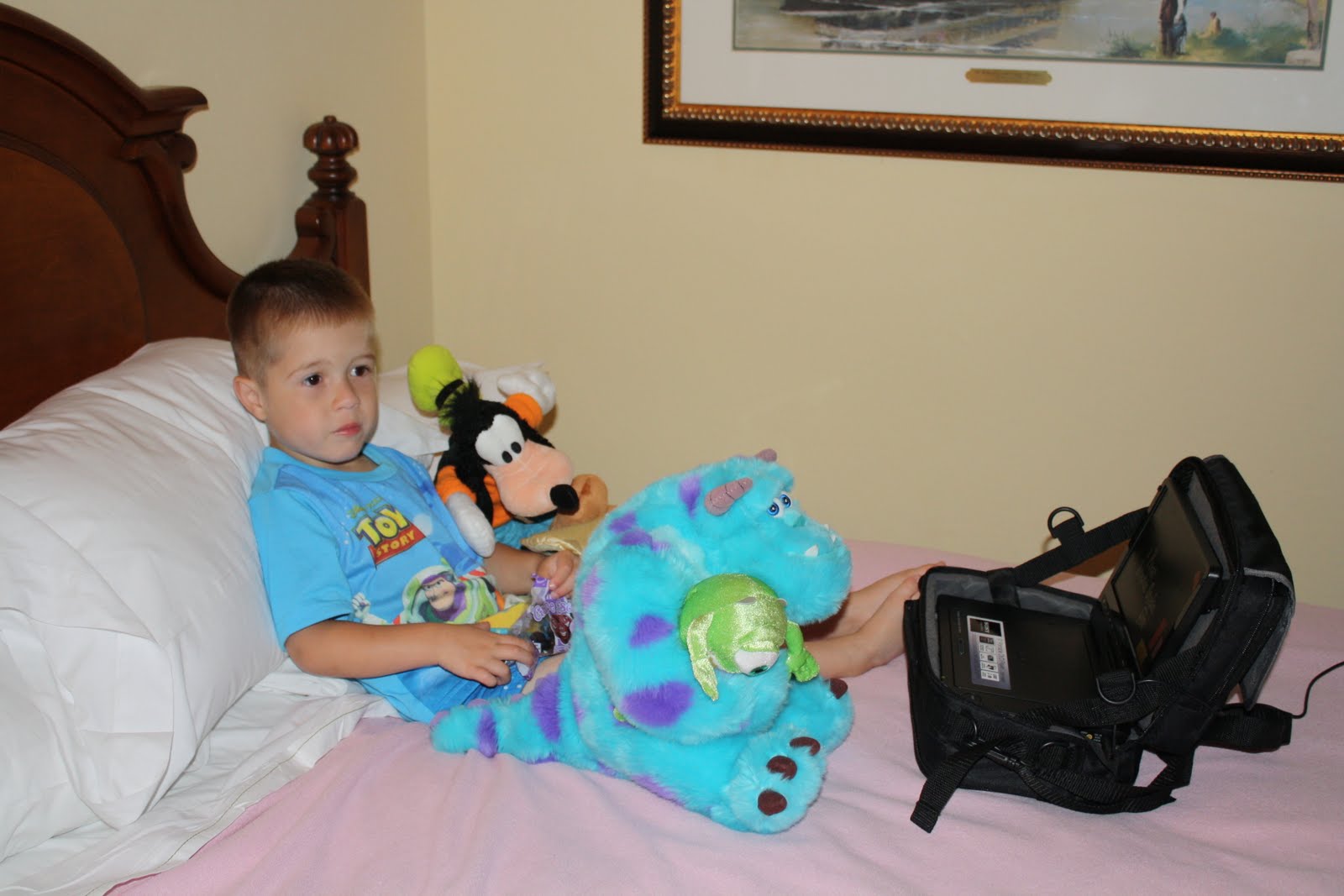 This just cracked me up- Craig and I went to get dinner for all of us after swimming and when we got back to the room Ga Ga had Andrew all bathed and ready for bed, propped up eating grapes and watching Monsters Inc with all his treasures from the day! Ha!